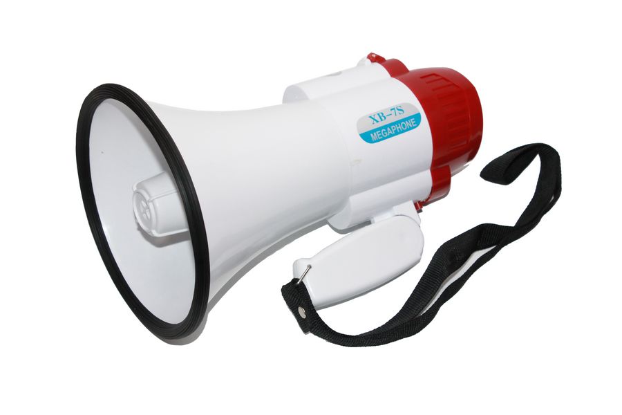 Мощность 15 Вт, работает от 4 батареек тип С, функции - громкоговоритель, запись, сирена, встроенный микрофон, складная ручка, напряжение 6 V, материал - ударопрочный пластик (ABS)