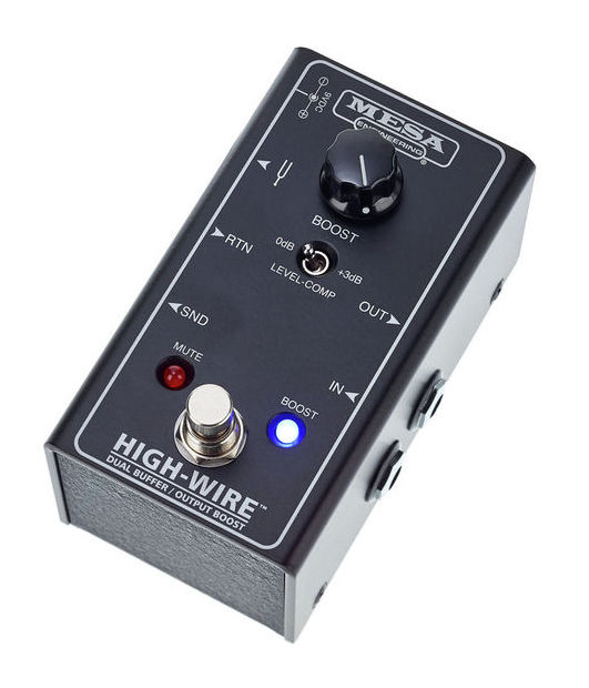 MESA BOOGIE HIGH-WIRE™ DUAL BUFFER & OUTPUT BOOST - два прибора в одном компактном корпусе: двойной буфер и линейный драйвер. Это устройство позволяет решить все проблемы согласования как по входу, так и по выходу. Располагаясь между инструментом и педалями, прибор обеспечивает стабильную нагрузку для датчиков гитары, гарантируя тем самым поступление полноценного сигнала на первую педаль в цепи. Если включить данный прибор между педалбордом и усилителем, он будет не только буферизировать сигнал, обеспечивая тем самым оптимальные сопротивление и рабочие характеристики, но и позволит получить с помощью встроенного линейного драйвера Footswitchable Boost сигнал более высокого уровня, что важно при использовании длинных кабелей. Как и в случае с прибором Stowaway, буфер выполнен на базе дискретной схемы класса Class-A. HIGH-WIRE также оборудован мини-переключателем +3dB BOOST, который расположен на верхней панели. Ножной переключатель обладает двойным действием, позволяя активировать функцию BOOST при однократном нажатии, и функцию MUTE при удерживании в течение секунды. HIGH-WIRE — универсальное решение, позволяющее избавиться от всех проблем, связанных с потерей качества сигнала при работе с педалбордами.