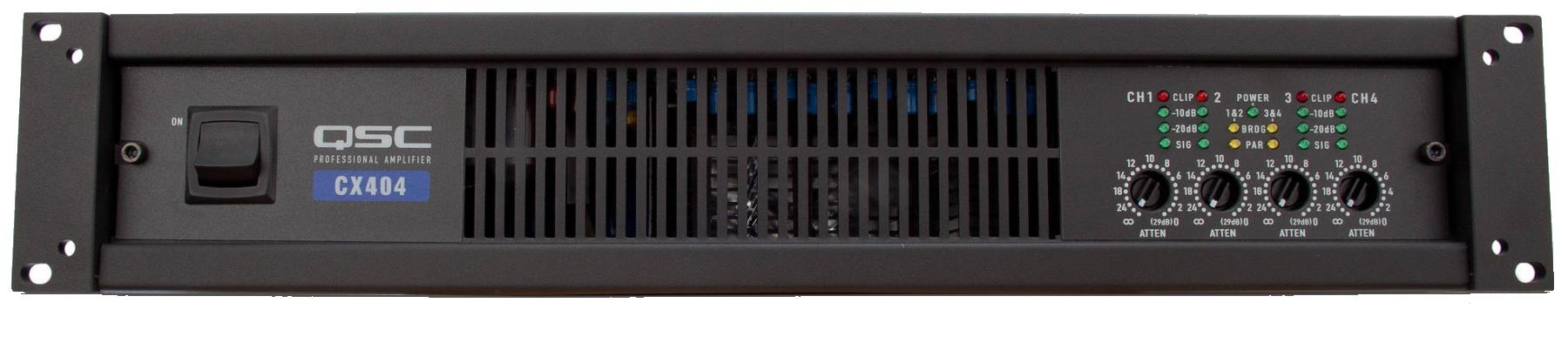 QSC CX404 – это профессиональный четырёхканальный рэковый низкоимпедансный усилитель мощности класса AB+B из серии СХ от компании QSC (высота – 2U). Он обеспечивает высокий уровень звука для профессиональных АС и может быть использован в турах, при озвучивании концертов, а также в постоянных и временных инсталляциях. Как правило, рекомендуется использовать усилитель с необходимой программной выходной мощностью или удвоенной номинальной RMS.