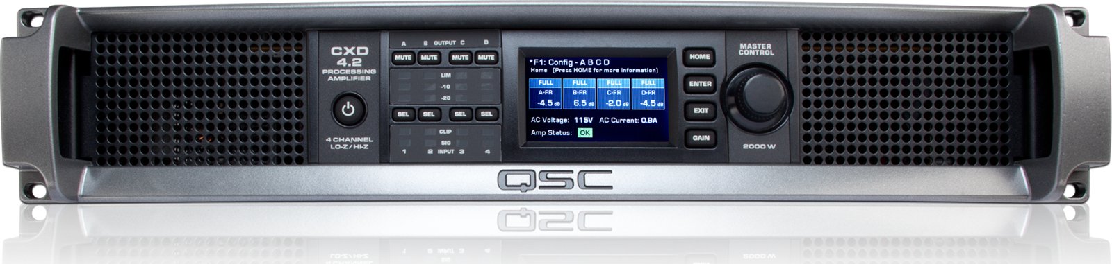QSC CXD4.2 несет на борту массу современных технологий для лучшей работы многоканальных систем. Технология FAST (Flexible Amplifier Summing Technology) распределяет суммарную мощность между одним, двумя, тремя или четырьмя каналами, за счет чего достигается оптимальная производительность. Встроенный DSP-процессор предлагает большой набор функций: кроссовер, фильтры параметрического эквалайзера, дилэй и лимитеры; всё это устраняет необходимость во внешних акустических процессорах. Есть 20 заводских пресетов настроек с возможностью редактирования и сохранения в 50 пользовательских ячеек. Встроенная система помощи упрощает настройку усилителя, позволяя выбрать необходимую конфигурацию из списка самых популярных пассивных громкоговорителей.