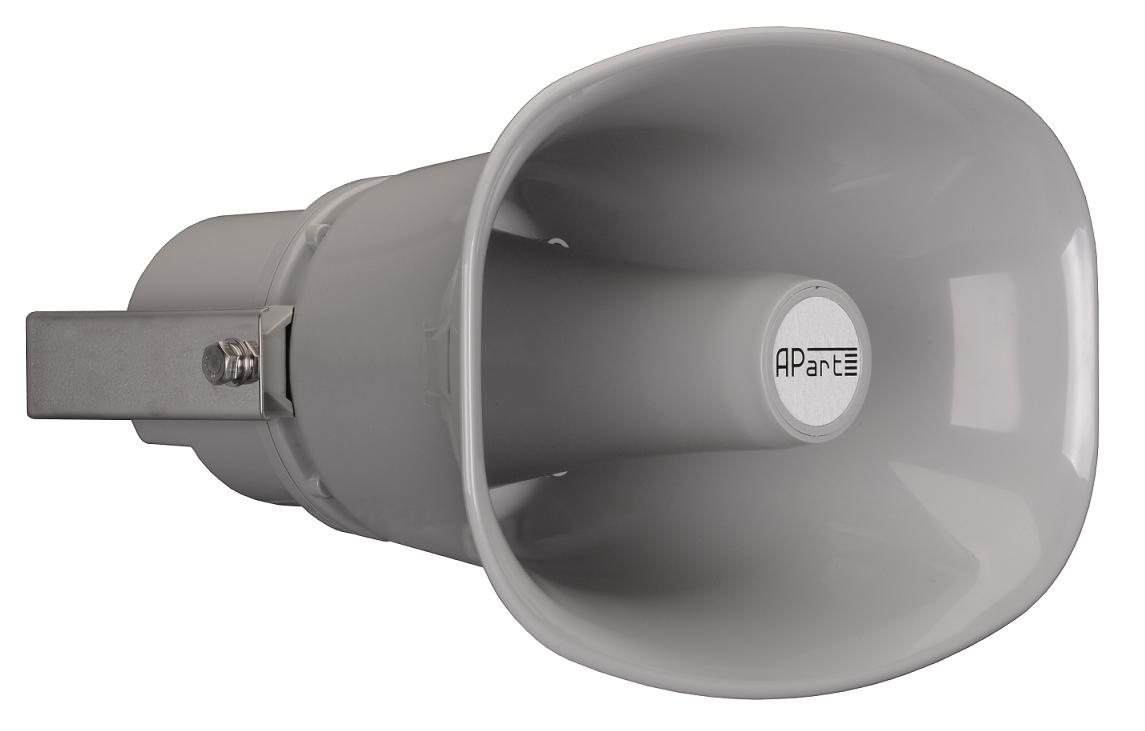 APart H30LT-G - Всепогодный рупорный громкоговоритель, мощность при подключении к 100 В линии 30 - 15 - 7,5 - 3,75 Вт (отводы трансформатора), при подключении на 8 Ом, макс. мощность 45 Вт, Громкоговоритель имеет хорошие акустические характеристики, может передавать речевые и тревожные сообщения с хорошим качеством. Громкоговоритель обладает высоким звуковым давлением. Устанавливать громкоговоритель можно как на улице (IP66), так и в помещении. Корпус акустической системы выполнен из ударопрочного пластика, в комплекте поставляется металлический кронштейн "скоба". При монтаже, можно отрегулировать положение громкоговорителя в двух плоскостях.