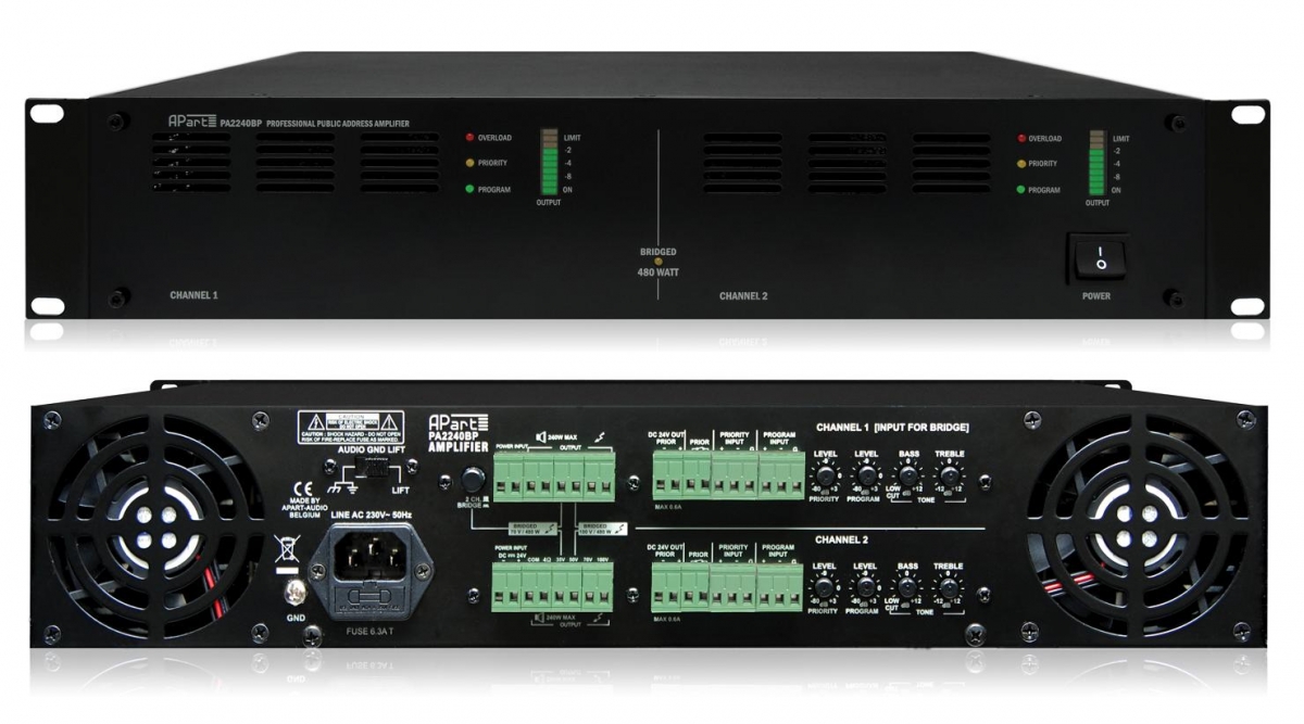 APart PA2240BP - Высококачественный двухканальный трансляционный усилитель мощности, 2 х 240 Вт, в мостовом режиме 480 Вт, По каждому каналу усилителя выходы 100, 70, 50 и 35В, предусмотрены выходы 4 Ом для подключения низкоомных громкоговорителей (в мостовом режиме выход 8 Ом).  Усилитель имеет 2 симметричных линейных входа и 2 приоритетных линейных входа. Приоритетные входы активируется сухими контактами, при поступлении сигнала на приоритетные входы, сигналы поступающие на обычный входы подавляются. Также, при активации приоритетных входов, на клеммах на задней стенке устройства появляется напряжение +24В DC (отдельно для каждого канала). Эту функцию можно использовать для подключения аттенюаторов с реле обхода или для иных задач. Уровень сигнала линейных и приоритетных входов регулируется на задней панели усилителя, там же можно отрегулировать частотные характеристики входных сигналов по каждому каналу. На передней панели усилителя располагаются индикаторы режимов работы усилителя. Питание устройства 220В АС и 24 В DC. В комплект поставки входят крепления для установки усилителя в аппаратный шкаф или стойку 19".