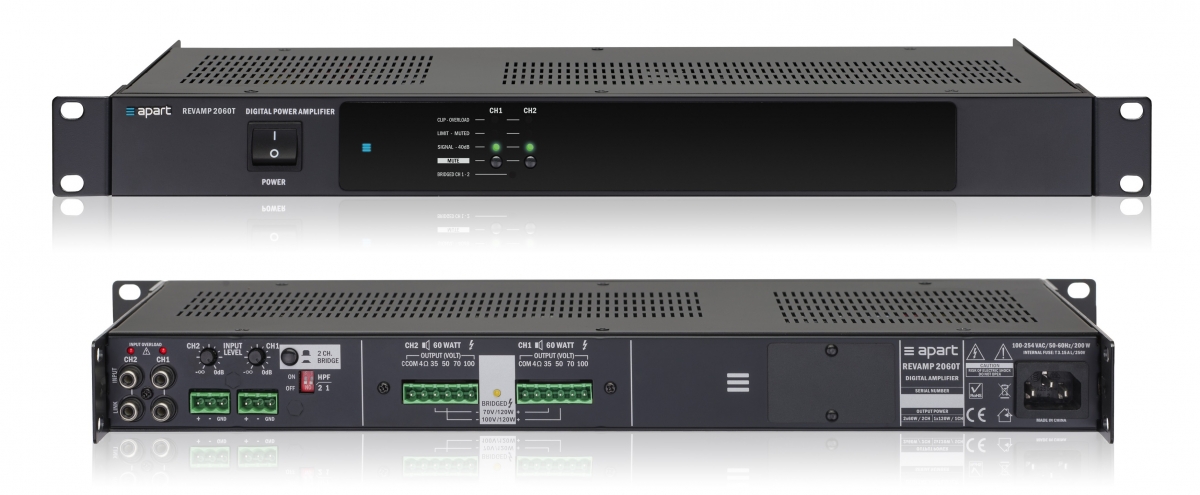 APart REVAMP2060T - профессиональный 2-канальный цифровой усилитель обеспечивает мощность каждого канала - 60W в линиях 100 - 70 - 50 - 35V и на нагрузке 4 Ом. В мостовом режиме усилитель развивает мощность 120W в линиях 100 - 70 - 50 - 35V и на нагрузке 8 Ом. Высокоэффективный блок питания и схемотехника класса D - дают малые габариты и вес. Система охлаждения - конвекционная. Каналы усилителя можно использовать для озвучивания 2-х моно зон, 1-й стерео зоны, в мостовом режиме - 1-й моно зоны. 2 несимметричных линейных входа RCA, два симметричных входа евроблок. Переключатели режимов стерео/мостовой - на задней панели усилителя. В комплекте поставки - крепления для установки в рэковую стойку 19".