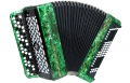 Трехрядная правая клавиатура двухголосное звучание 55 нот от ноты "ля-диез" большой октавы до ноты "ми" четвертой октавы, в левой части (басы) готовый аккомпанемент от ноты "фа" контроктавы до ноты "ми" большой октавы с одновременным звучанием в четырех октавах.