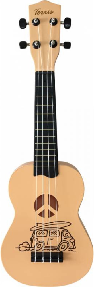 TERRIS PLUS BUS - укулеле песочного цвета, на верхней деке которой изображен автобус, а резонаторное отверстие выполнено в форме пацифика.
