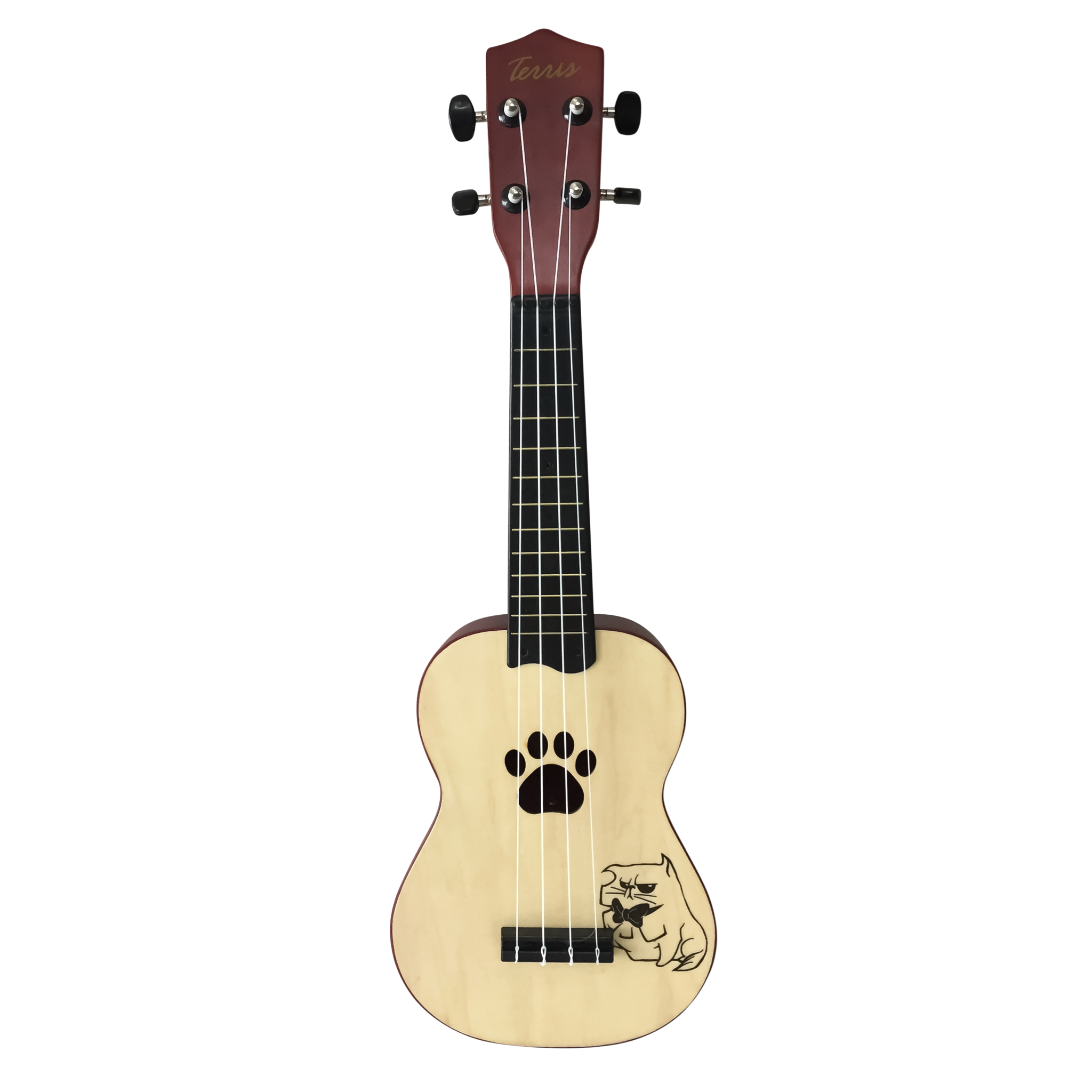 TERRIS PLUS CAT - укулеле натурального цвета, на верхней деке которой изображен кот, а резонаторное отверстие выполнено в форме кошачьей лапки.