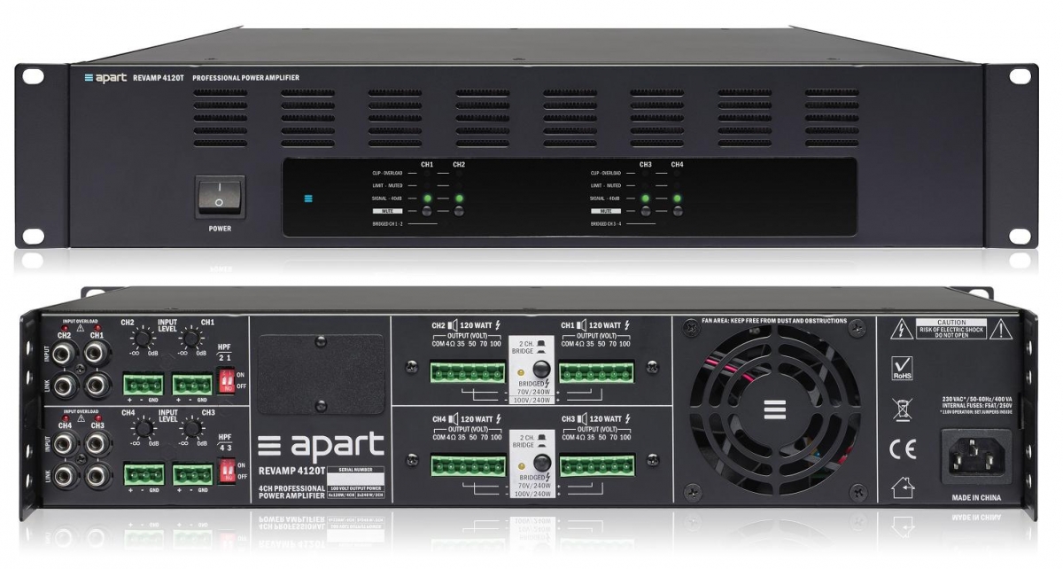 APart REVAMP4120T - это профессиональный 4-канальный цифровой усилитель мощности 4 х 120 Вт 100 - 70 - 50 - 35 вольт или  4 Ом, в мостовом режиме 2 х 240 Вт 100 - 70 - 50 - 35 вольт или 4 Ом. Устройство включает высокоэффективные блок питания, выходные каскады класса D. Интеллектуальный вентилятор с переменной частотой вращения. Возможно использование в режимах - 4 моно зоны или 2 стерео зоны, в мостовом режиме 2 моно зоны или одна стерео зона. 4 несимметричных линейных входа RCA 1-4, четыре симметричных входа евроблок 1-4. Переключатели режимов стерео/мостовой для каждой пары каналов на задней панели усилителя. В комплект поставки усилителя входят крепления для установки в аппаратный шкаф или стойку 19".