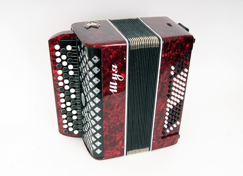 Клавиатуры: Правая– пуговичная, имеет 47 клавиш (тонов и полутонов) расположенных на грифе в три ряда. Левая– кнопочная, имеет 80 кнопок с готовыми аккордами, расположенных в пять рядов.