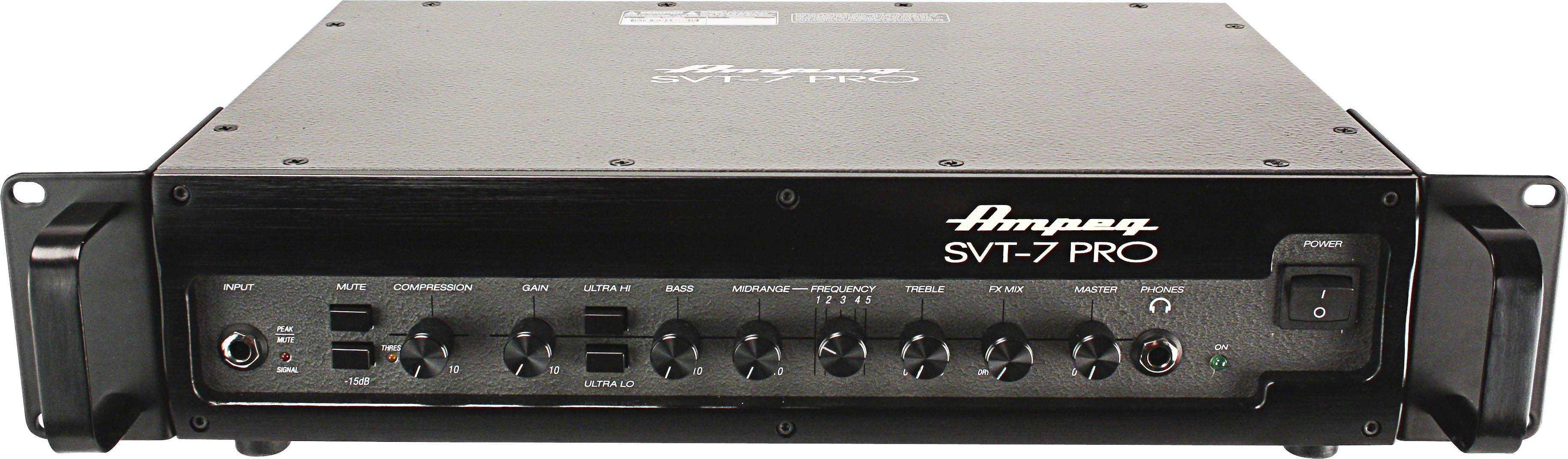AMPEG PRO SVT-7PRO - выполнен на пяти лампах (12AX7), по своему размеру занимает одну единицу (1U) рэкового пространства. Усилитель обладает одним инструментальный входом (Input) с кнопкой-аттенюатором (- 15 bB) и кнопкой заглушения выходного сигнала – Mute. Светодиодный индикатор показывает пик сигнала и заглушение выхода — Peak/Mute). Хорошо реализованы регуляторы-кнопки включения корректирующих фильтров — Ultra Lo и Ultra Hi. Так в режиме – «Ultra Lo» происходит плотный подъем уровня низких частот, одновременно с небольшим ослаблением «середины».