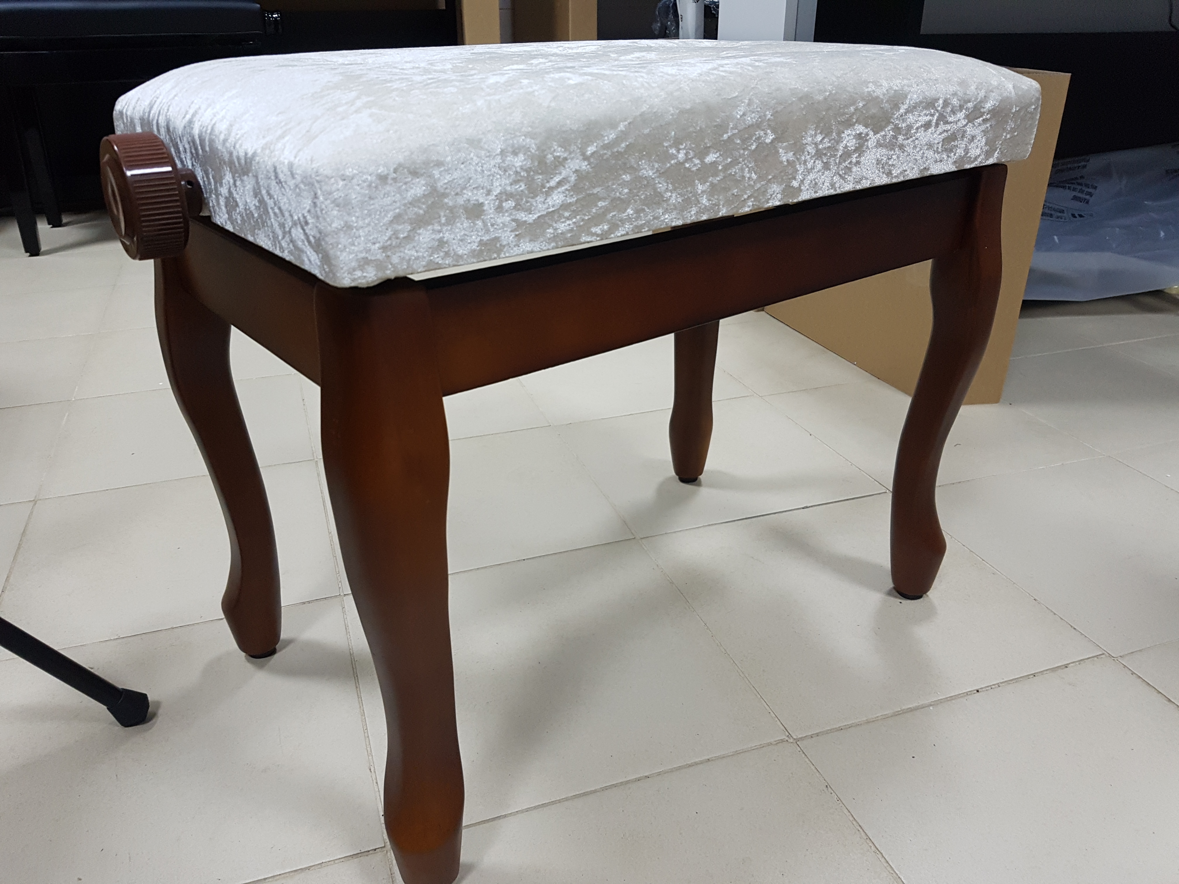 Банкетка для пианино или рояля деревянная, цвет - белый перламутр, подъемный механизм регулировки высоты, пластиковые ручки, гнутые ножки, размер - 56х33х48-58, обивка - бархат