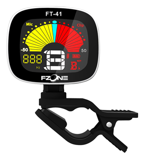 FZONE FT-41 - Тюнер универсальный с прищепкой хроматический, цветной ЖК дисплей, микрофон, Led индикация (3 диода) точности настройки, авто выключение.3v AAAх2, частота A0(27.5Hz)-A3(1760Hz), 97х61х15мм. Цвет черный.