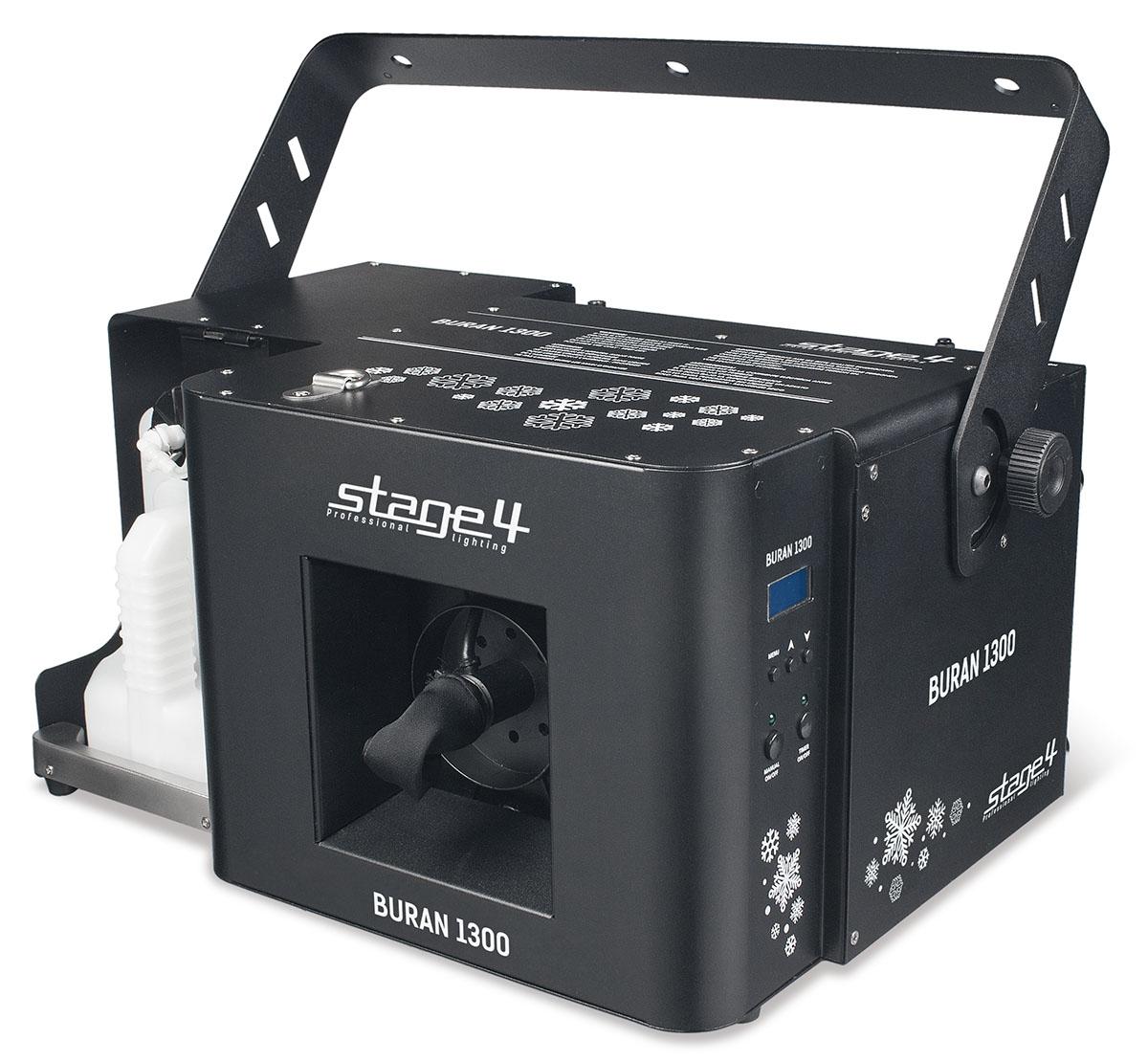 STAGE4 BURAN 1300. - Генератор сценического снега. Мощность 1300Вт, дистанция выброса - до 9м, канистра для жидкости: 5,6л, управление: DMX-512, панель на корпусе (таймер с пресетами), опциональный проводной ПДУ, расход жидкости: 263 мл/мин, уровень шума: 65Дб/1м, лира для подвеса, габаритные размеры (ШхВхГ), 670.
