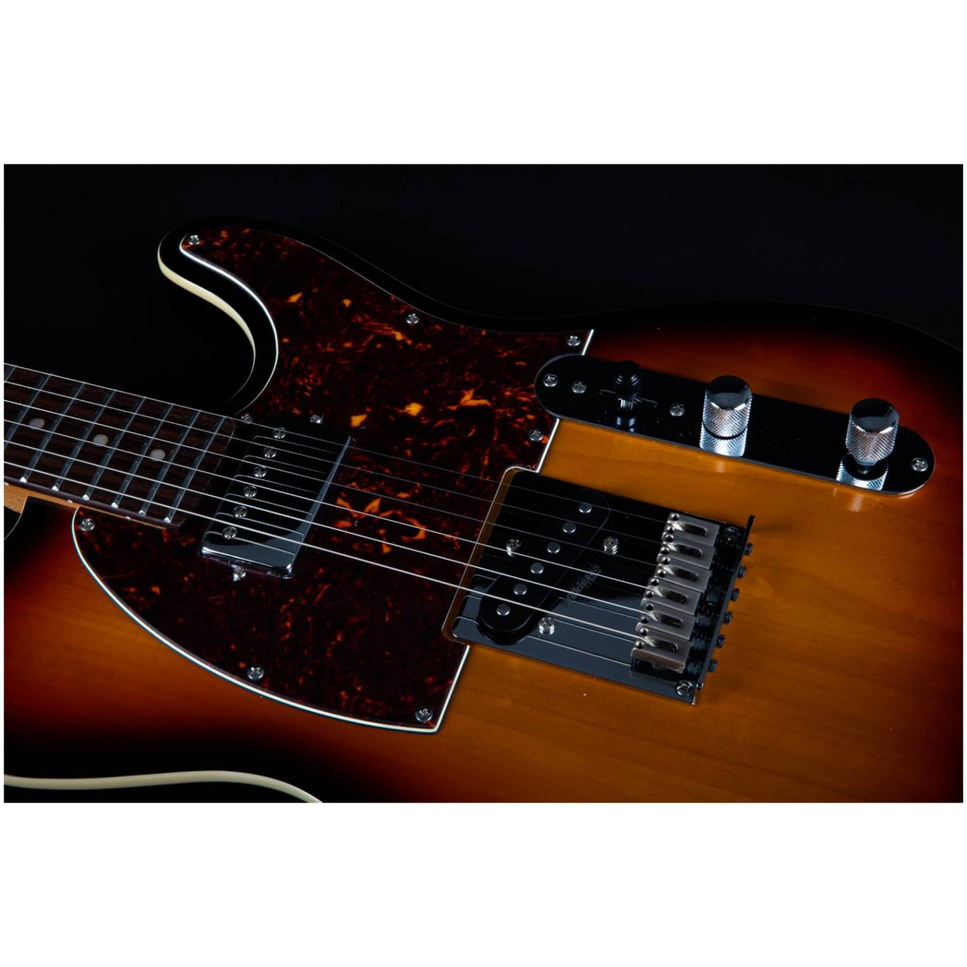 Гриф выполнен из печеного клена (roasted maple). При такой обработке поры дерева максимально сжимаются и в процессе использования вода уже не будет выходить, гриф не сожмется и лады не повылазят вне зависимости от влажности и смены температуры. Плюс такое дерево выглядит очень красиво. Накладка на гриф выполнена из палисандра. Конфигурация звукоснимателей у модели JET JT-350 SB R - SH Alnico.