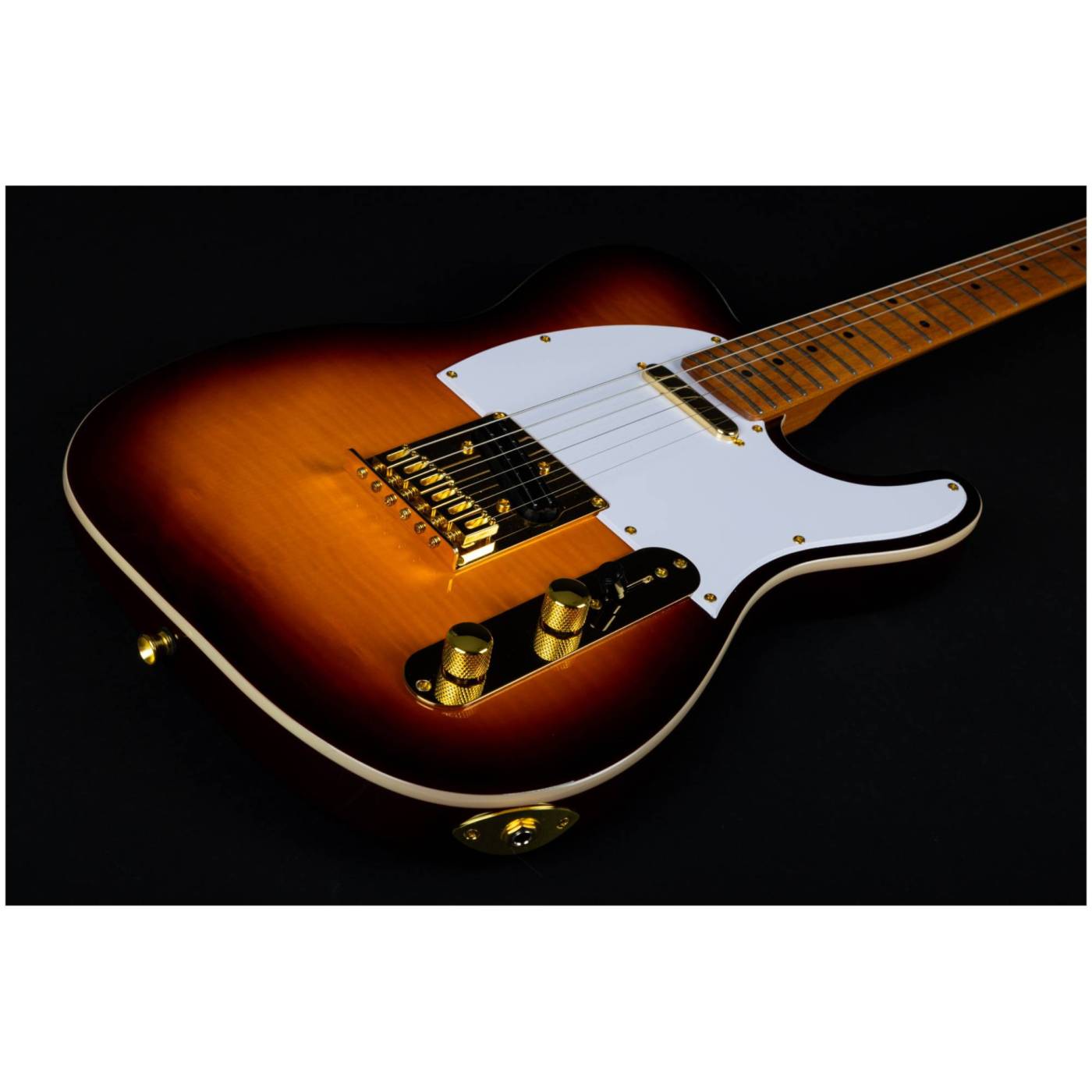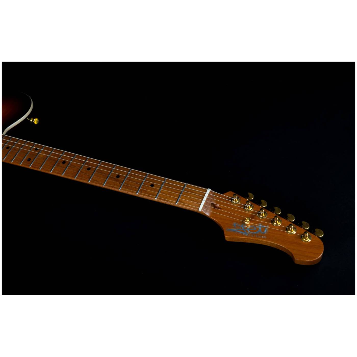 Гриф и накладка на гриф выполнены из печеного клена (roasted maple). При такой обработке поры дерева максимально сжимаются и в процессе использования вода уже не будет выходить, ваша накладка не сожмется и лады не повылазят вне зависимости от влажности и смены температуры. Плюс такое дерево выглядит очень красиво.