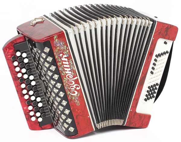 Клавиатуры: Правая– пуговичная, имеет 37 клавиш (тонов и полутонов) расположенных на грифе в три ряда. Левая– кнопочная, имеет 60 кнопок с готовыми аккордами, расположенных в пять рядов.