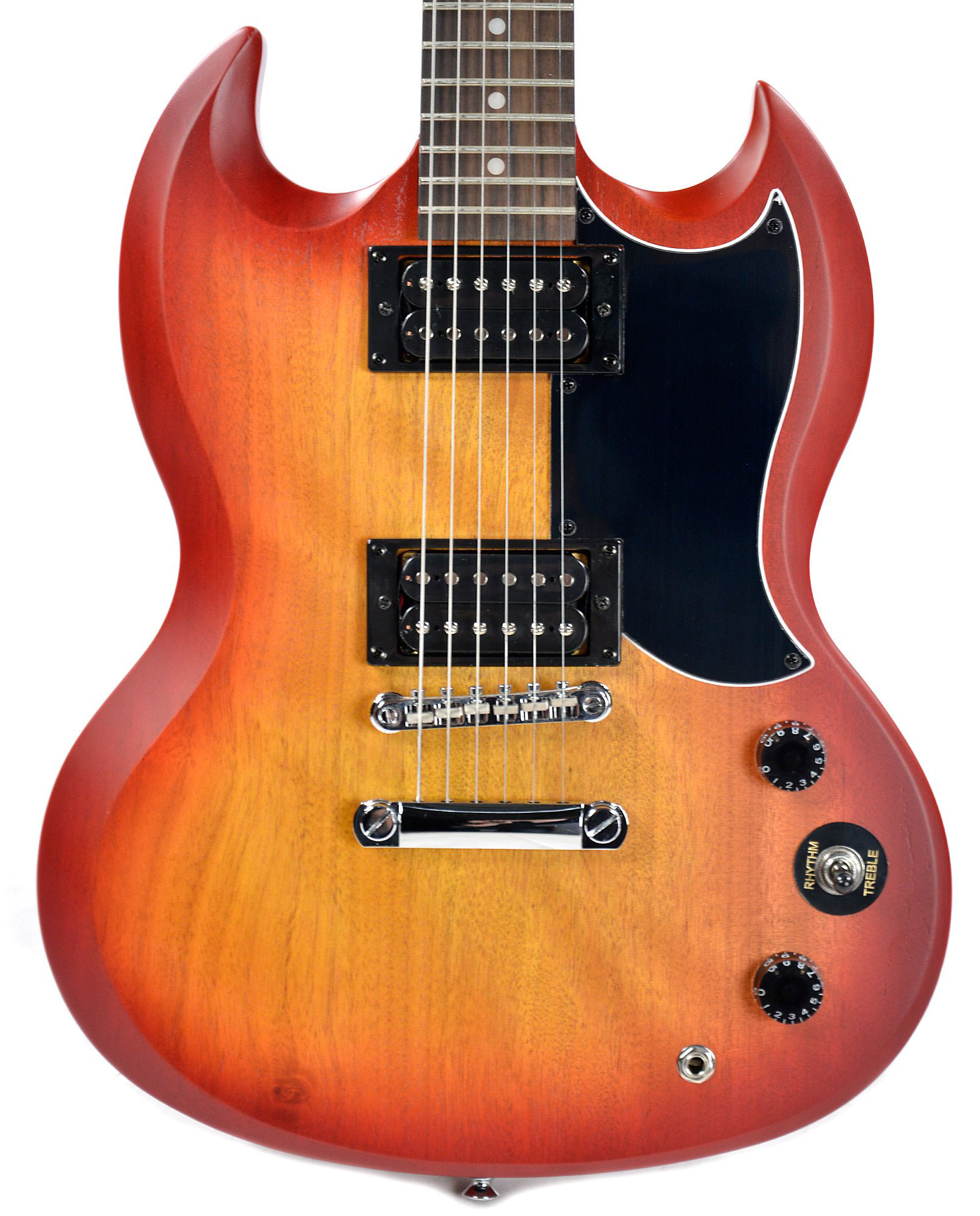 С момента выпуска и до сегодняшнего дня легкие, но мощные электрогитары серии SG стали классикой хард-рока, охватывая широкий круг игроков, включая Eric Clapton, братьев Allman, Tony Iommi из Black Sabbath и Pete Townshend из The Who. Новые SG-Special VE™ имеют всё тот же культовый дизайн. Корпус гитары изготовлен из тополя со шпоном из красного дерева и черной накладкой, гриф SlimTaper™ D профиля изготовлен из Окуме и имеет стандартную мензуру 24.75” и 22 средних лада джамбо, плюс инкрустации в виде перламутровых точек. Голова грифа стиля "Clipped Ear" имеет логотип Epiphone эпохи 60-х годов в серебре и логотип "2017" Edition сзади. SG-Special VE™ доступны в пяти цветах: Cherry, Ebony, Heritage Cherry Sunburst, Vintage Sunburst и Walnut.