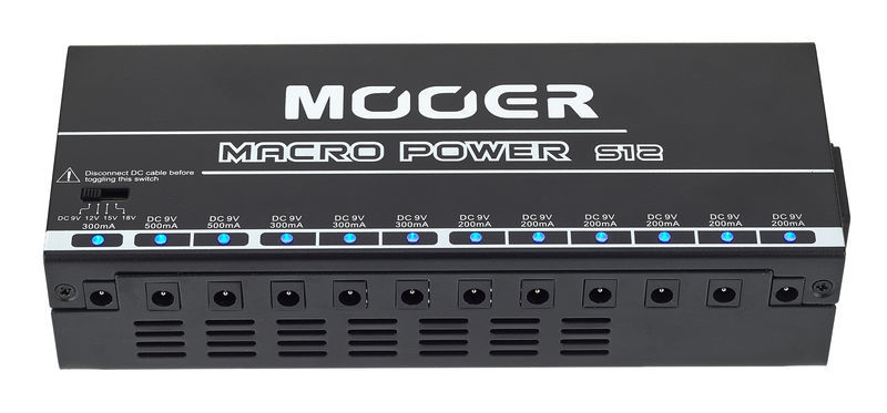 MOOER MACRO POWER S12 - блок питания для гитарных педалей, входное напряжение: 230В (220В-240В) или 115В (110В-120В) переключаемое, суммарная сила выходного тока: 3400 мА, 13 кабелей питания в комплекте (6 x 460мм, 6 x 610мм, 1 x 200мм с реверсивной полярностью), ремень velcro в комплекте, Размеры: 225 × 88 × 50 мм, вес: 1.82 кг.