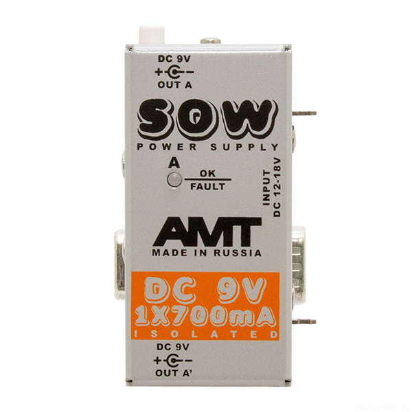 Использование гальванически развязанных напряжений позволяет избежать возникновения токовых петель. Отсутствие помех по питанию позволяет добиться лучшего качества звучания.Питание осуществляется от первичного модуля AMT SOW PS-1 или от внешнего адаптера питания с выходным напряжением 12-18В и током не менее чем имеют в сумме подключаемые к нему педали.