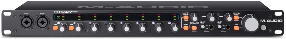 M-Audio MTrack Eight оборудована 8 комбинированными XLR/1/4" jack входами, 8 1/4" выходами, переключаемым фантомным питанием и двумя выходами для наушников. По словам компании в этом интерфейсе использованы лучшие предусилители и минимизированы задержка и шумы. M-Track Eight специально разработан для расширения возможностей записи с ультра низким уровнем шума на пути сигнала, 112Дб соотношением сигнал/шум и мониторингом с нулевой задержкой, а также с ПО Avid Pro Tools Express. Для записи аудио выше, чем CD качество интерфейс имеет 24-бит/96 кГц разрешение и восемь XLR+1/4" комбинированные входы для подключения любого источника. Все combo jack входы с mic/line автоопределением, а каналы 1 и 2 имеют переключатель уровня инструмента, который удобно расположен на передней панели для легкого доступа, когда интерфейс установлен в рэк. Включенные выходы: восемь 1/4" TRS, две пары 1/4" для мониторов с регулятором А/В и два 1/4" выхода для наушников, переключаемые между выходами 1 и 2 или 3 и 4.