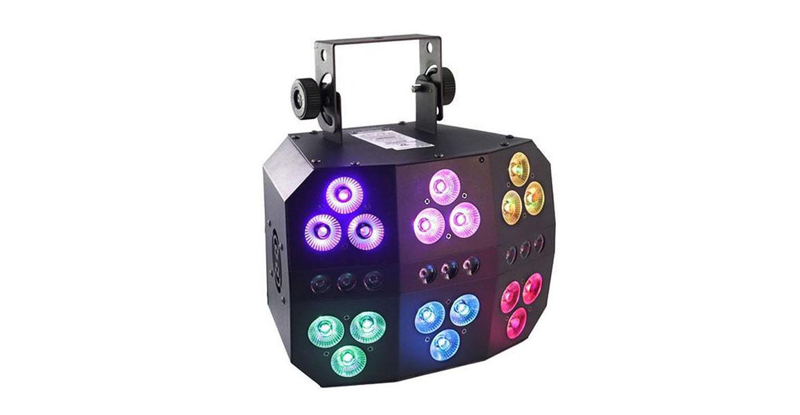 Прибор световых эффектов, источник света WASH: 18*8W RGBWUV 5-in-1 LEDs, STROB: 9*1W White SMD LEDs , DMX-512 – 3,6,10,37 кан., строб, электронный диммер 0-100%, Master-slave/Auto/Sound/IR, питание 100/240V AC 60/50Hz, мощность 170 Вт., 3.6 kg.
