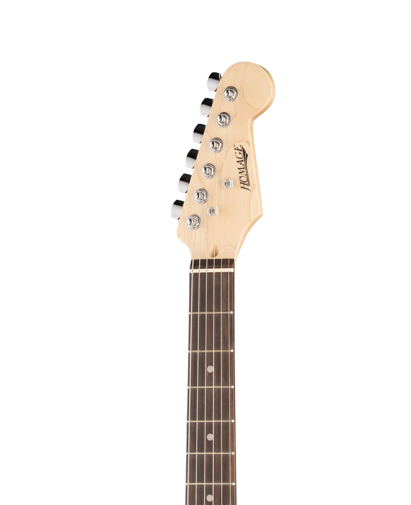 HOMAGE HEG320SB Электрогитара форма стратокастер. Мы рекомендуем начинающим гитаристам выбирать гитары данной формы, так как она имеет лучшую, по нашему мнению эргономику. Гитара имеет два звукоснимателя, так называемых сингла и один хамбакер. Данное сочетание звукоснимателей позволяет играть большинство стилей музыки.