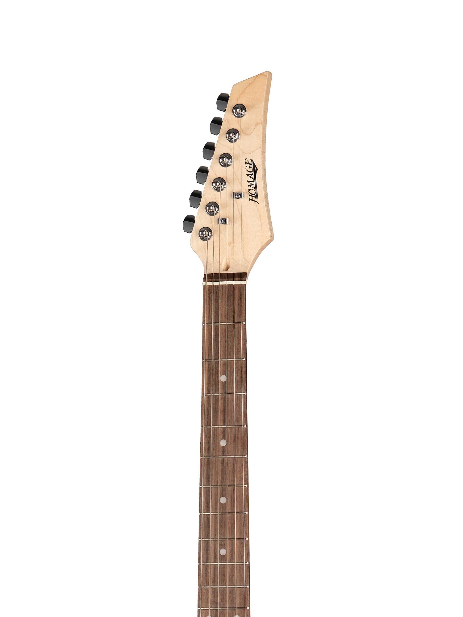 Homage HEG341BL Электрогитара форма суперстрат. Мы рекомендуем начинающим гитаристам выбирать гитары данной формы, так как она имеет лучшую, по нашему мнению эргономику. Гитара имеет два звукоснимателя хамбакер. Данное сочетание звукоснимателей позволяет играть большинство стилей музыки, но больше ориентировано на тяжёлые.