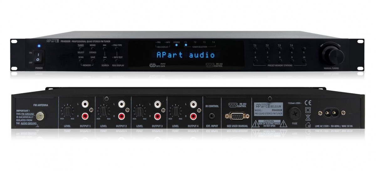APart PR4000R - профессиональный четырехканальный FM тюнер с функцией RDS. По сути, устройство представляет из себя 4 FM тюнера в одном корпусе. PR4000R удобно использовать при построении многоканальных систем озвучивания и трансляции, например при установке в гостиницах, когда в номерах предусматривается возможность выбора радио программ (при использовании настенного селектора программ). Управление тюнером осуществляется с передней панели устройства, с помощью пульта ДУ или по RS232, а задней панели тюнера расположены 4 стерео выхода RCA для каждого из 4-х каналов. Уровень выходного сигнала регулируется. Возможен выбор режимов моно/стерео. В комплекте поставки предусмотрены съемные крепления ля установки в аппаратный шкаф 19".