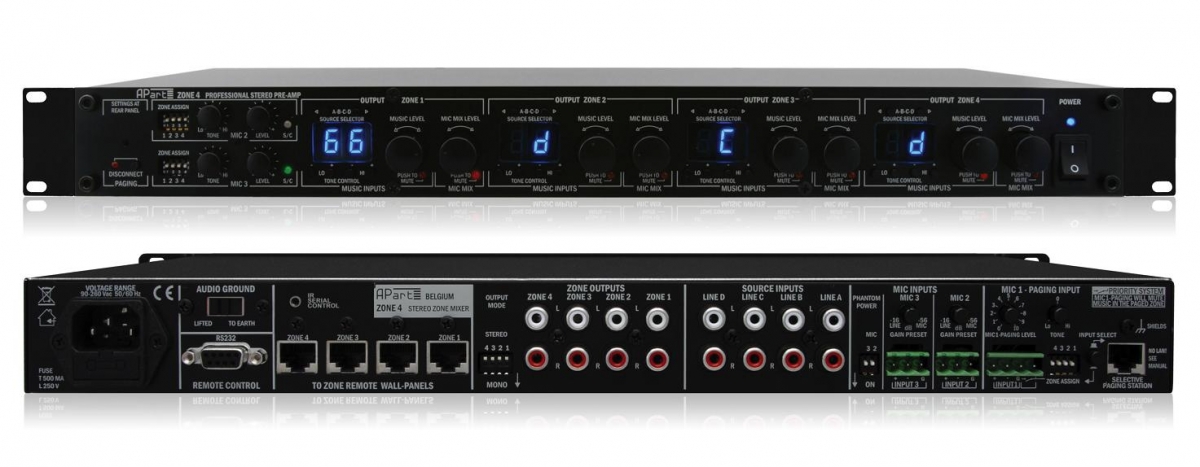 APart ZONE4 - многофункциональный предварительный усилитель. Общая конфигурация - (3 микрофонных + 4 линейных входа) x 4 линейных выхода. Фактически устройство является матричным коммутатором, любые входные сигналы можно коммутировать с любым линейным выходом предусилителя. Управление ZONE4 осуществляется на передней панели устройства или с удаленных контроллеров управления ZONE4R, которые можно расположить непосредственно в зонах трансляции/озвучивания и на месте выбирать нужный источник сигнала и регулировать громкость. К предварительному усилителю можно подключить всего до 8-ми удаленных контроллеров кабелем UTP (до 100м). ZONE4 также позволяет подключать микрофонные станции с селектором на 4 зоны MICPAT-4 (всего до 4-х микрофонных панелей кабелем UTP до 100м к входу MIC1 - RG45). Предусмотрено управление устройством по RS232. Для первого микрофонного входа (MIC1) предусмотрено включение функции приоритета. Для всех входов и выходов устройства можно отрегулировать уровень сигнала и уровень ВЧ и НЧ. Блок может устанавливаться в аппаратный шкаф или стойку 19" с помощью креплений входящих в комплект поставки. Питание предусилителя 220В АС.