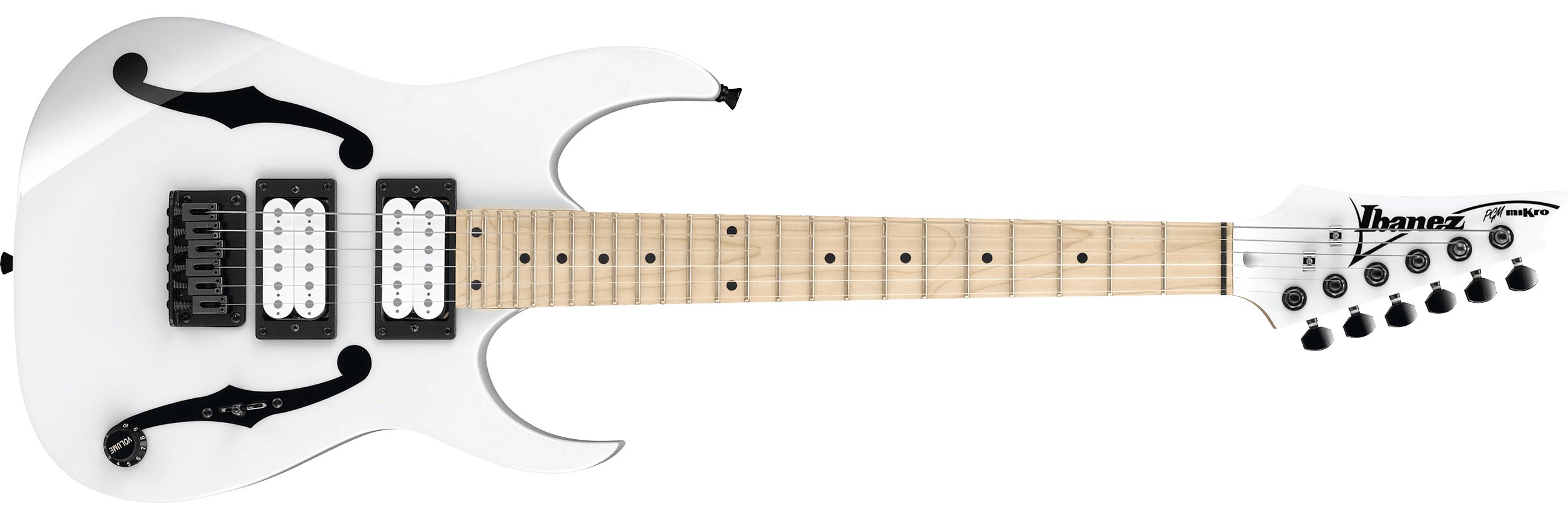 IBANEZ PGMM31-WH Paul Gilbert Signature miKro – шестиструнная электрогитара из линейки PGM, подписная модель знаменитого гитариста-виртуоза Пола Гилберта (Mr. Big). Модель представлена Ibanez в 2017 году. Этот стильный инструмент компактного форм-фактора MiKro имеет укороченную мензуру - 22,2’’ (564 мм). На этой электрогитаре очень удобно играть, если у Вас небольшая рука, она будет прекрасным выбором для девушек или подростков. PGMM31 – недорогая модель с прекрасным звуком, имеющая необычный стильный внешний вид. В её конструкции используются высококачественные материалы и комплектующие. Корпус гитары выполнен из тополя. Гриф – профиля PGMM, кленовый, с накладкой также из клёна. Радиус накладки – 400 миллиметров. Гриф инкрустирован черными точками. На гитаре установлены 2 открытых пассивных хамбакера Infinity R с керамическими магнитами. Элементы управления включают один регулятор громкости и 3-позиционный переключатель звукоснимателей. Бридж PGMM31-WH – фиксированный. Представленная гитара отличается оригинальным дизайном. Инструмент окрашен в элегантный белый цвет с головой грифа в цвет корпуса, с черной фурнитурой и контрастными графическими изображениями черного цвета на деке, имитирующими отверстия формы «f», характерные для гитар с полым корпусом.