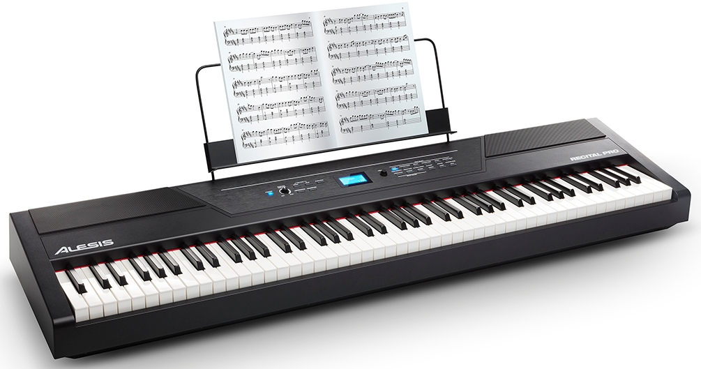 ALESIS RECITALPRO - портативное цифровое фортепиано с молоточковой механикой, двухполосной системой звукоусиления и двенадцатью встроенными тембров, включая звуки электропиано, акустического пианино, церковного органа, клавесина и прочих инструментов.