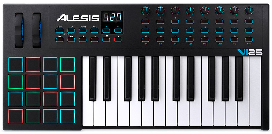 ALESIS VI25 - усовершенствованная USB/MIDI клавиатура и MIDI контроллер, который позволяет взять господство над программным обеспечением серией пэдов, ручек и кнопок. Благодаря 25 полноразмерной полувзвешенной клавиатуре чувствительной к скорости нажатия и с функцией послекасания, а также кнопкам повышения/понижения октавы, вы расширите клавиатуру до полного мелодического диапазона с бас линией, аккордами и мелодиями. Кроме того, контроллер имеет 8 назначаемых ручек и 24 назначаемых кнопок для управления плагинами эффектов и виртуальными инструментами: открывают и закрывают фильтры, регулируют уровень громкости, активируют эффекты, настраивают параметры и многое другое. 16 чувствительных к скорости нажатия пэдов с подсветкой предназначены для запуска клипов или проигрывания барабанных партий пальцами с необыкновенной отзывчивостью и визуальной разноцветной обратной связью, а колеса тона и модуляции расширят выразительность вашего исполнения.