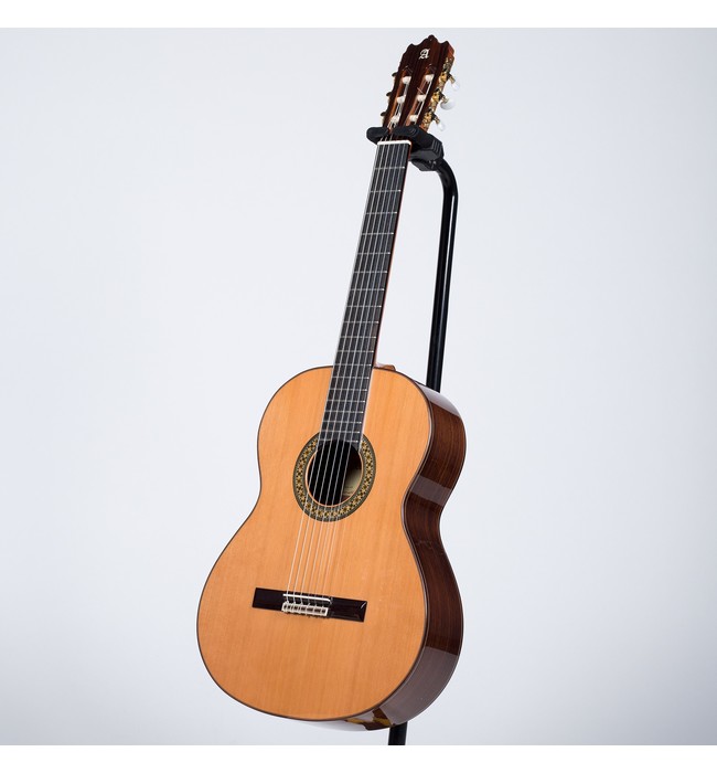 Четыре слоя легкого лака подчеркивают текстуру верхней деки изготовленной из западного красного кедра (туи складчатой) и великолепный ламинат палисандра задней деки и обечайки. Накладка грифа из замечательного черного дерева.