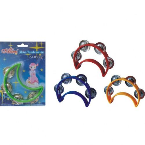 Alice ATB009 - детский пластиковый тамбурин в форме месяца с 4-мя металлическими джинглами-тарелочками. Удобная эргономичная ручка обеспечивает комфорт во время игры. Тамбурин - ударно-шумовой инструмент, старинный ручной барабан с бубенчиками, родственный бубну. Изначально тамбурин - название старинного французского (прованского) барабана. Так как по-итальянски бубен и тамбурин называются одинаково tamburino, произошло искажение терминологии, и современные бубен и тамбурин на практике одинаковы. ALICE ATB009 доступен в нескольких цветах: синий, желтый, зеленый, красный.