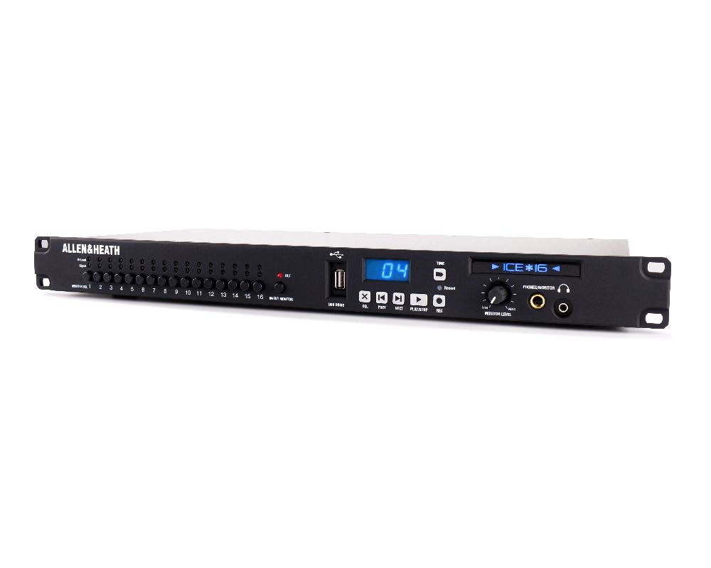 Allen & Heath ICE-16 - 16-канальный рекордер. ICE-16 способен обеспечить конвертацию и двунаправленную передачу 16 каналов аудио студийного качества с разрешением 24 бита / 96 кГц по интерфейсам USB 2.0 или FireWire. Помимо этого, устройство позволяет выполнять многоканальную запись прямо на USB накопители или жесткие диски в формате WAV 24 бит с частотой дискретизации до 48 кГц. ICE-16 масштабируется, так что можно использовать несколько устройств для синхронной записи большего количества каналов. Стоит заметить, что при всех своих возможностях, ICE-16 имеет компактные размеры и занимает одно стандартное рэковое место 1U.