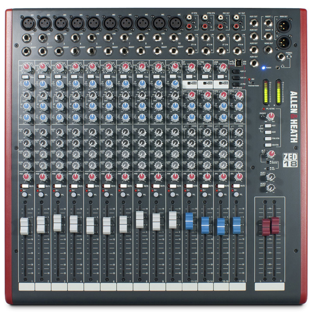 Allen&Heath ZED18 имеет USB соединения посыла и возврата для записи, воспроизведения и создания эффектов. 10 моно микрофонных / линейных входов снабжены 2-х ступенчатыми высококачественными предусилителями DuoPro, 3-полосным эквалайзером с параметрической cерединой на моно-линейках и 100 мм фейдеры, все это в компактном формате.