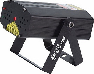 Micro Galaxian - компактное дополнение в линейку световых эффектов Galaxian от American DJ. Размеры - 50 x 120 x 90 мм. Вес: 0.6 кг. Дает свыше 200 красных и зеленых лазерных лучей (30мВт (532nm) зеленый лазер и 80мВт (650nm) красный лазер). Этот простой прибор не требует DMX-программирования, поставляется со встроенными программами и функцией активации от звука. Имеется беспроводной пульт управления, контролирующий функции автоматический режим/звуковая активация, смену цветов (красный, зеленый, красный+зеленый, случайный выбор), вращение и пр. Потребляемая мощность: 9 Вт при максимальной нагрузке. Охлаждение вентилятором. Двойная лира для подвеса или установки на поверхность.