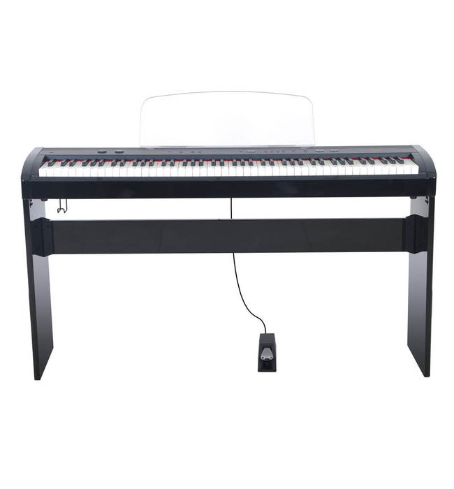 Artesia A-10 Black polished - отличный выбор для начинающих музыкантов. Отлично подойдёт для тех, кто имеет большое желание научиться играть на фортепиано, но ограничен в средствах. Artesia A-10 полностью удовлетворит потребности начинающего пианиста. Ваши первые шаги в исполнении фортепианных произведений можно записывать в память инструмента! Взвешенные молоточковые динамические клавиши делают ощущения от игры максимально похожие на ощущения от игры на классическом акустическом инструменте. Акустическая система представляет собой 2 динамика, суммарной мощностью 30 Вт. Более того, в комплект с самим инструментом входит и деревянная стойка и педаль рояльного типа. Блок питания и подставка для нот (пюпитр) тоже поставляются в комплекте.