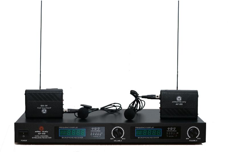 - Комплектация: блок питания, аудиокабель Jack – Jack (6.3мм), база приемник, два поясных передатчика, две головные гарнитуры., инструкция по эксплуатации, пластиковый кейс.