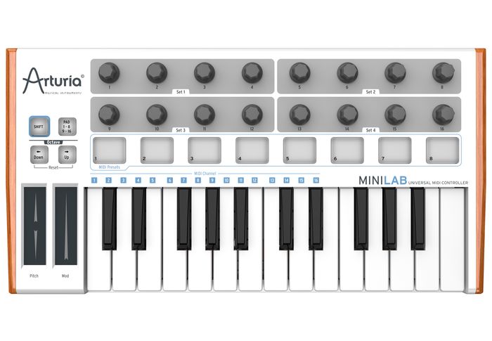 MiniLab питается от USB и имеет 25 чувствительных к скорости нажатия мини-клавиш, совершенно новые сенсорные контроли высоты тона и модуляции для максимальной музыкальной выразительности, и всё это в компактном корпусе. 16 многофункциональных энкодеров - больше, чем на любом USB / MIDI контроллере аналогичного размера – обеспечивают многофункциональный контроль. Также устройство снабжено двумя банками пэдов с яркой подсветкой, которые функционируют как пэды, MIDI CC кнопки или программируемые переключатели для быстрого взаимодействия с любым устройством, подключенным к MiniLab (через USB-порт и вход для педали-сустейна).