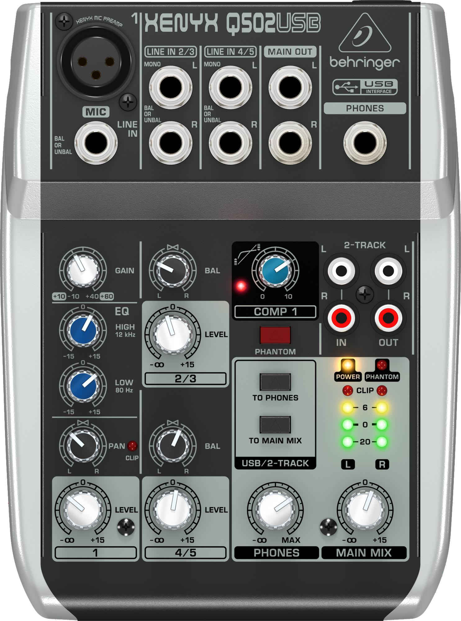 XENYX Q502USB – все что нужно для невероятного звука! Благодаря оснащенному микрофонному предусилителю этот микшер можно использовать с динамическими и студийного класса конденсаторными микрофонами. Микшер имеет 5 входов, 2-полосный британского стиля эквалайзер, обеспечивающий теплую и музыкальную коррекцию тона, а также RCA CD/Tape вход и выход.