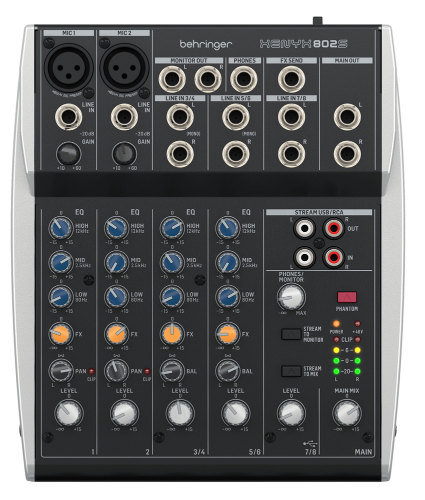 Новая серия XENYX «S» может подключаться к компьютерам или мобильным устройствам через USB, что упрощает интеграцию цифровых источников с аналоговым оборудованием. Два моно и 2 стерео канала с эквалайзером, плюс стерео канал, стерео RCA Streaming вход и стерео USB вход позволяют смешивать в общей сложности 12 кристально чистых аудиосигналов для мониторинга через наушники или высококачественные TRS выходы. Таким образом, 802S также можно использовать в качестве универсального Sub микшера для комбинирования подключенных к сети аудиоустройств с несколькими аудиосигналами.802S оснащен 3-полосным эквалайзером на Mono и Stereo входах, и позволяет с точностью формировать звук для любого входящего источника. Интегрированное управление FX посылом на каждый канал позволяет подключать любой внешний процессор эффектов на выбор для невероятной гибкости звуковых эффектов, например такой, как Behringer FX2000. Если к линейным стерео входам 7/8 ничего не подключено, то для удобной регулировки уровня USB входа можно использовать регулятор Level 7/8.