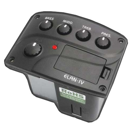 BELCAT ELAN-4 - Активный звукосниматель для акустических и классических гитар с предусилителем (питание 9V,ресурс около 700 часов для нормальной щелочной барейки,0,7мА), 4-х полосным эквалайзером, регулировкой эффекта присутствия(presence) и пьезодатчиком Omega II. Упакован в блистер.
