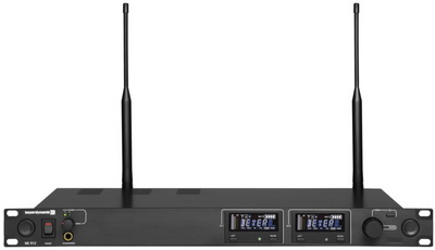 Двухканальный UHF приемник, металлический корпус, цветной LCD дисплей, ACT/SCAN-функция, ПК управляемый, поставляется с рэковым креплением, кабелем и креплением для выноса антенн на фронтальную часть.
