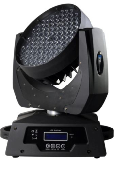 Вращающаяся голова, 108 высокомощных (3 Вт) светодиодов (24 красных + 28 зеленых + 28 голубых + 28 белых). Раn 540° Tilt 265°. Электронный диммер 0-100%. Строб 0-10 вспышек в секунду. Управление: DMX512 (12 каналов), звуковая активация.