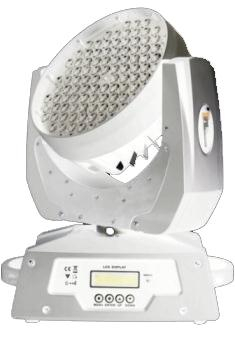 Вращающаяся голова, 108 высокомощных (3 Вт) светодиодов (24 красных + 28 зеленых + 28 голубых + 28 белых). Раn 540/630° Tilt 265°. Электронный диммер 0-100%. Строб 0-18 вспышек в секунду. Управление: DMX512 (12 каналов), звуковая активация.