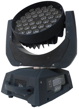 Вращающаяся голова, 36 высокомощных (10 Вт) 4-х чиповых (RGBW 2,5 Вт на каждый цвет) светодиодов. Баланс белого. Раn 540/630° Tilt 265°. ZOOM 8-60°. Электронный диммер 0-100%. Строб 0-18 вспышек в секунду. Управление: DMX512 (13 каналов), звуковая активация.
