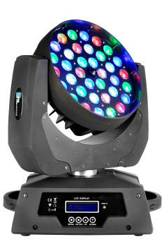 Вращающаяся голова, 36 светодиодов по 10W (10R + 10G + 10B + 6W). Zoom 15° - 60°. Раn 540/630° Tilt 280°. Электронный диммер 0-100%. Строб 0-18 вспышек в секунду. Управление: DMX512, звуковая активация, автоматический режим, master/slave. Питание: AC110-2.