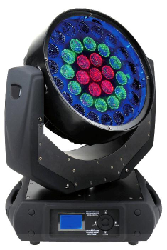Вращающаяся голова, 37 высокомощных (10 Вт) 4-х чиповых (RGBW 2,5 Вт на каждый цвет) светодиодов. Баланс белого. Раn 450° Tilt 300°. ZOOM 15-60°. Электронный диммер 0-100%. Строб 0-18 вспышек в секунду. Управление: DMX512, звуковая активация.