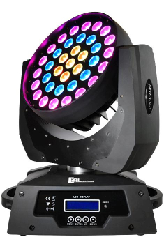 Вращающаяся голова, 37 светодиодов 3W 3-in-1 (RGB). Раn 540/630° Tilt 280°. Электронный диммер 0-100%. Строб 0-18 вспышек в секунду. Управление: DMX512, звуковая активация, автоматический режим, master/slave. Питание: AC110-250V 50-60HZ. Габариты: 229x330.