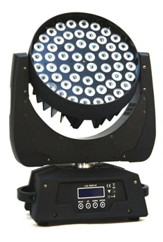 Вращающаяся голова, 56 высокомощных (10 Вт) 4-х чиповых (RGBW 2,5 Вт на каждый цвет) светодиодов. Баланс белого. ZOOM 8-60°. Раn 540° Tilt 265°. Электронный диммер 0-100%. Строб 0-18 вспышек в секунду. Управление: DMX512, звуковая активация.